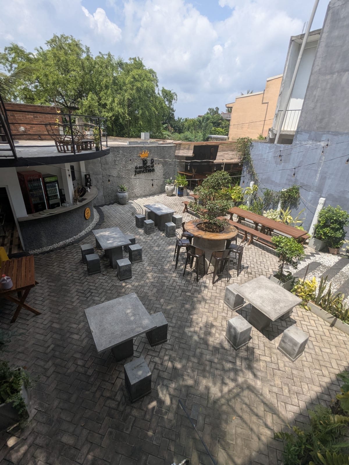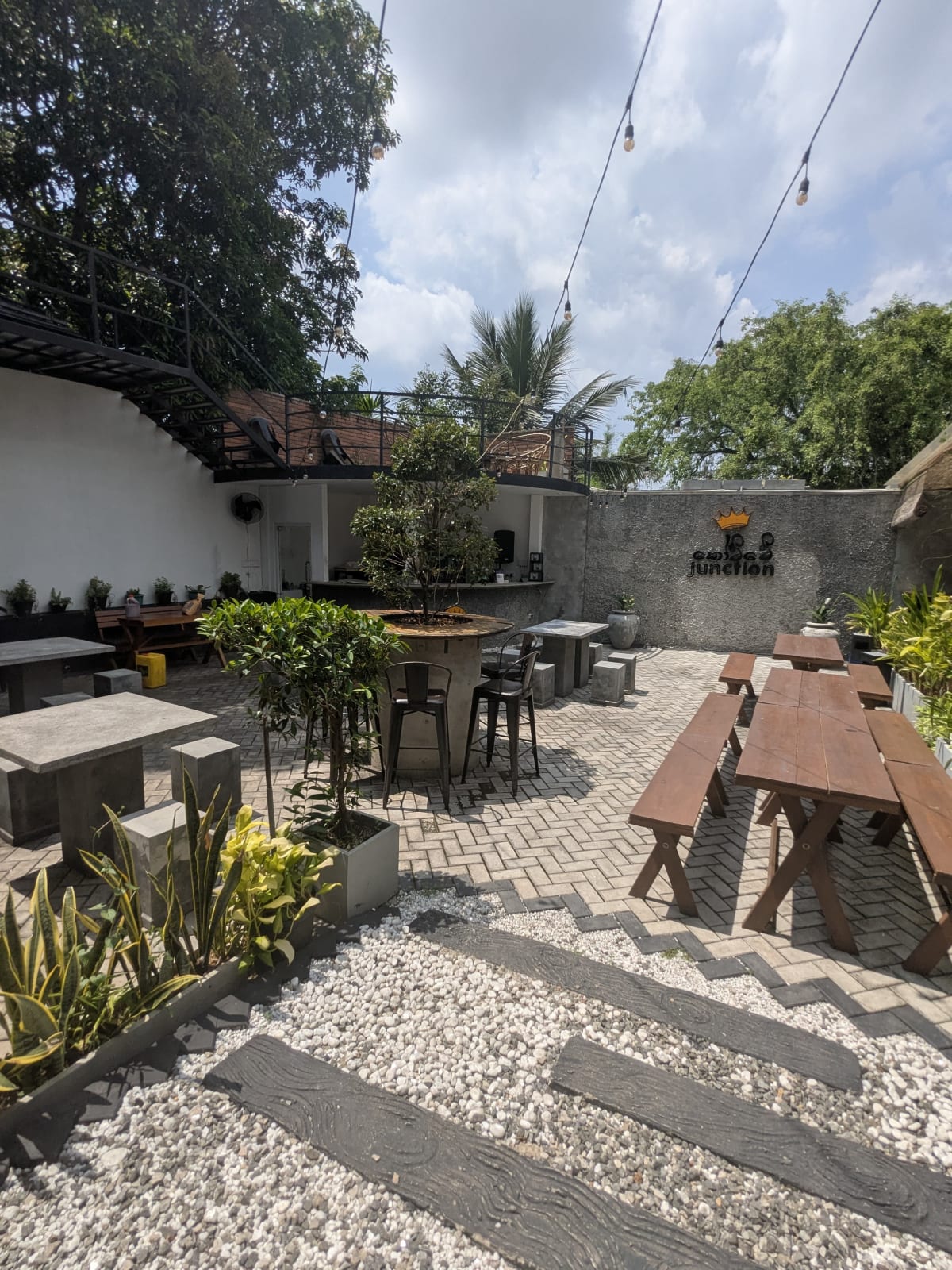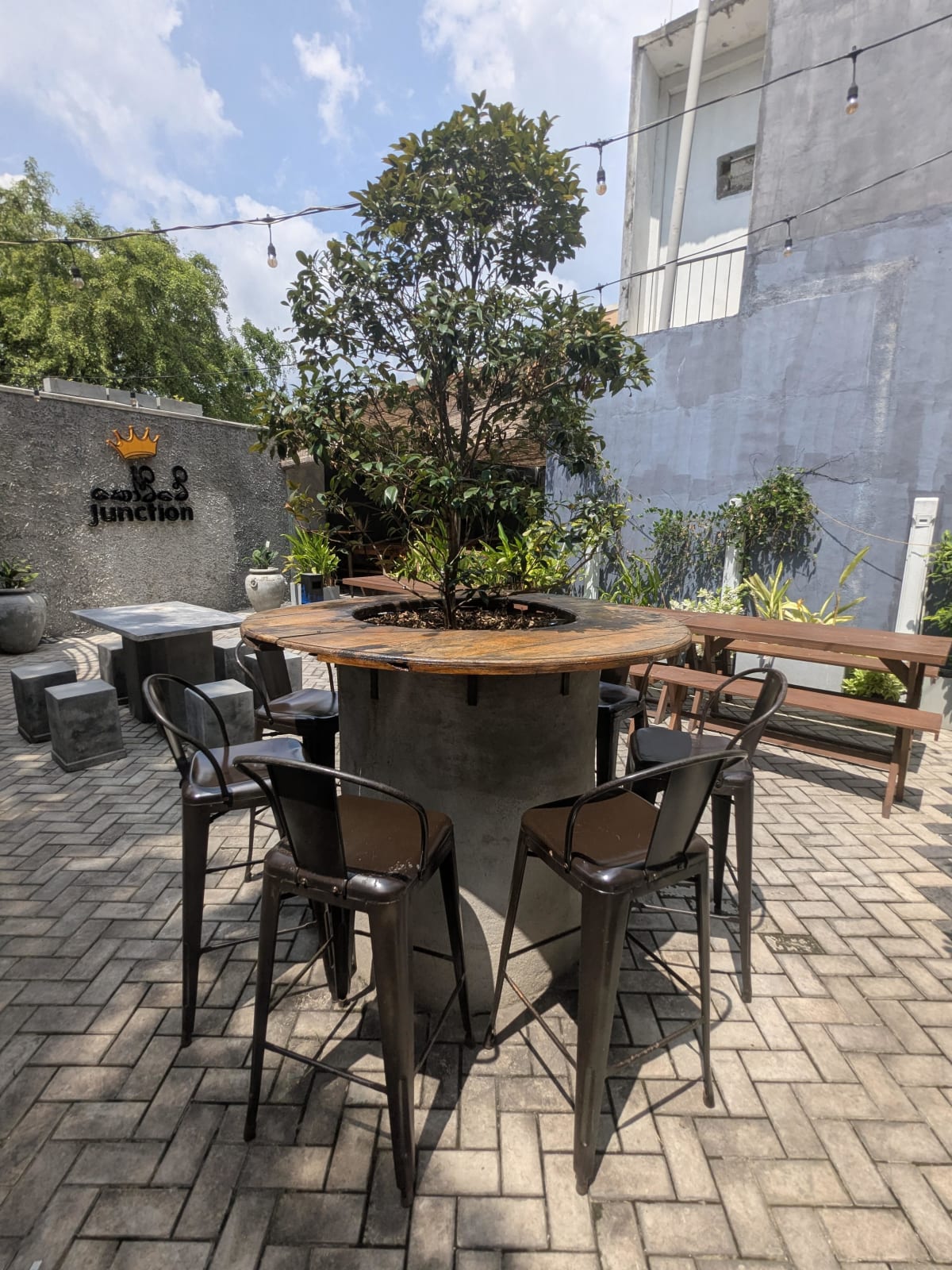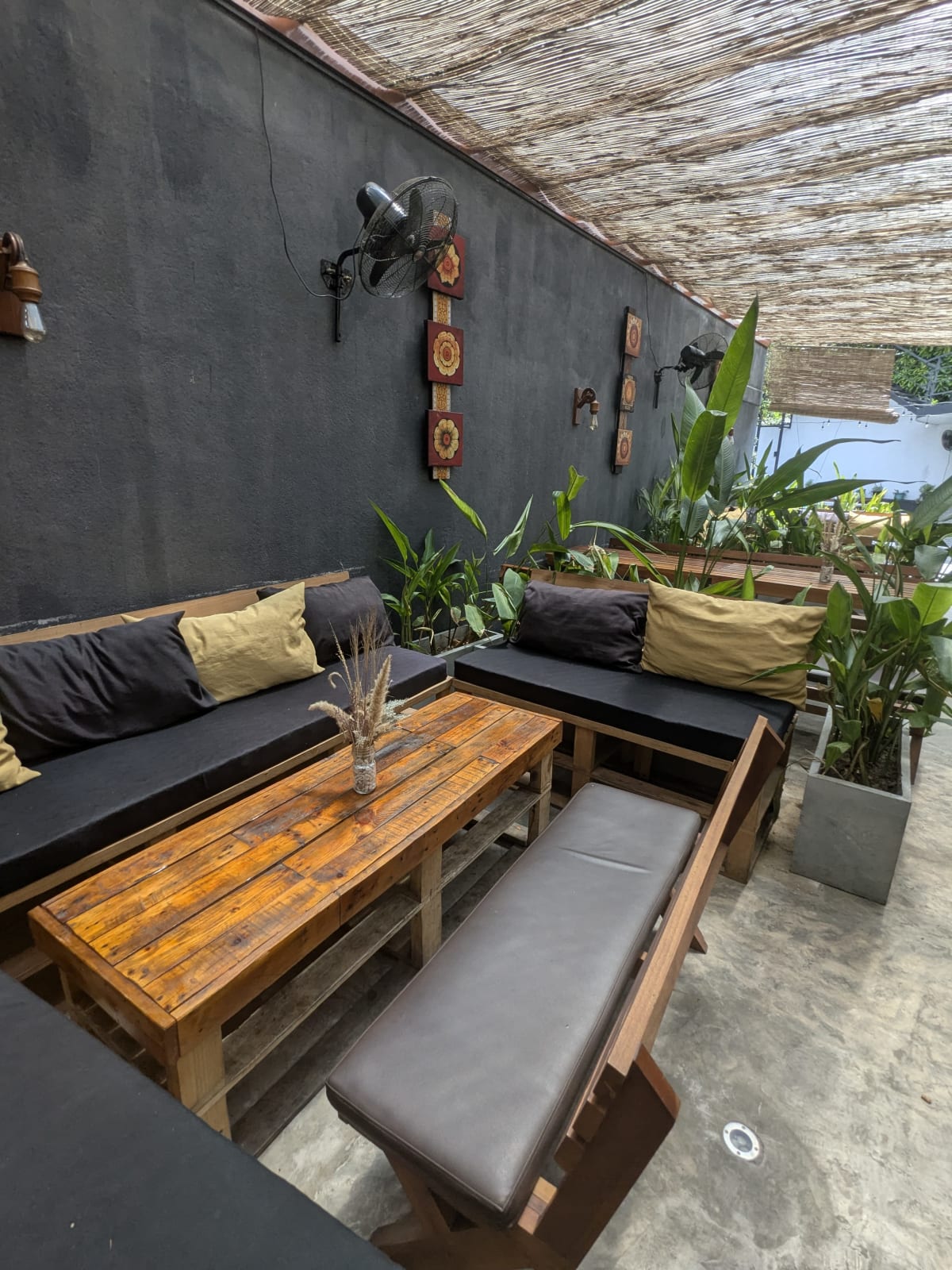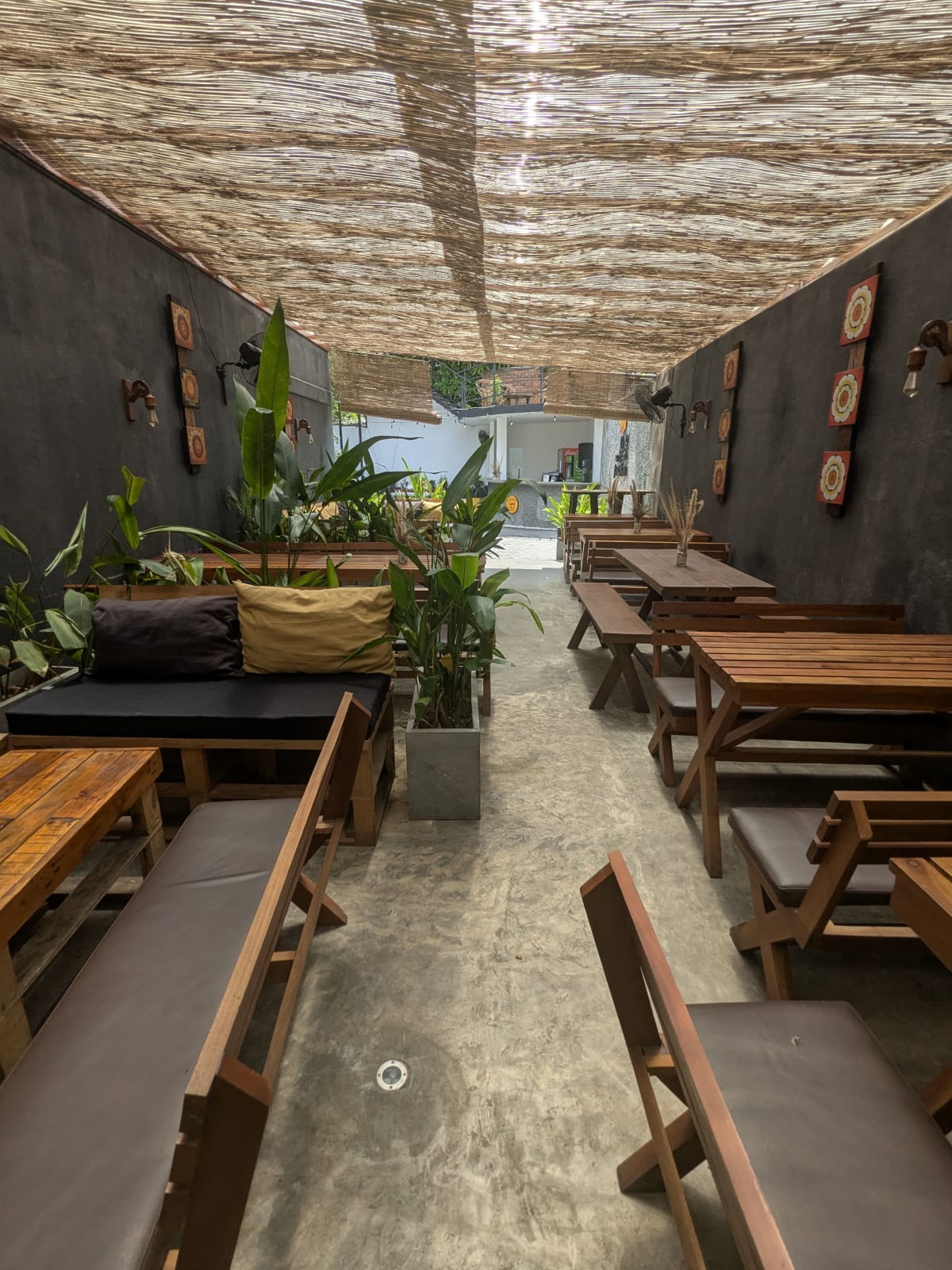 Kotte Junction welcomes you with an ambiance that’s both inviting and eclectic. The outdoor courtyard, paved with herringbone bricks, is adorned with lush greenery and rustic wooden furniture, creating a garden dining experience in Colombo that feels like a serene escape. Fairy lights strung across the space add a magical touch, while the woven bamboo ceiling provides shade and a tropical vibe.