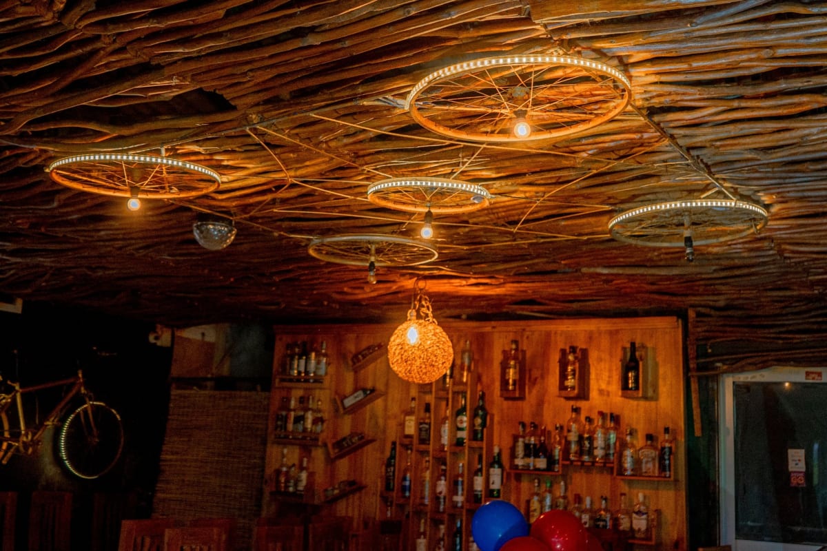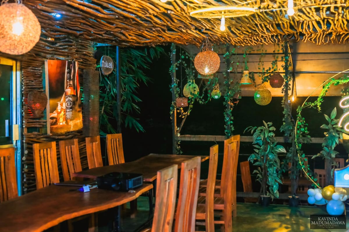 Step inside Moonlight Resort and Restaurant, and you’re greeted by a warm, rustic interior that exudes charm and character. The decor is a thoughtful blend of natural elements and modern touches, with wooden tables crafted from raw timber, woven twig ceilings, and walls adorned with lush artificial greenery. The lighting is a highlight, with spherical wicker lamps and upcycled bicycle wheels fitted with LED lights, casting a soft, golden glow that enhances the cozy vibe. The open-air rooftop section, framed by cascading vines and fairy lights, offers panoramic views of the surrounding greenery, making it an ideal spot for those seeking hangout spots in Colombo with a touch of nature.