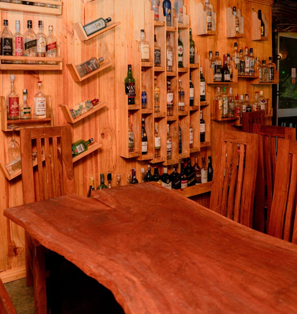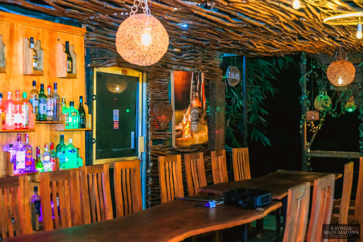 The interior also features a well-stocked display of liquor bottles, a nod to the venue’s BYOB policy, which allows guests to bring their own drinks without additional fees. This setup, paired with the rustic wooden chairs and communal tables, creates a welcoming environment that’s perfect for groups and small parties. The attention to detail in the decor—down to the smallest elements like woven wall art and tropical plants—makes Moonlight Resort and Restaurant a standout among restaurants in Colombo for those who appreciate aesthetic appeal as much as good food.